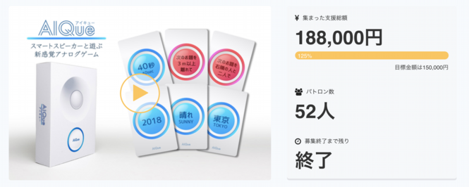 1月より「 CAMPFIRE」にてクラウドファンディングを実施していた新作カードゲームの「AIQue」が、目標に対し125%となるご支援をいただき無事に目標を達成いたしました。パトロンの皆様やSNS等で応援いただいた皆様、ありがとうございました。5月頃の商品化を目指して制作を続けてまいります。 AIQueの公式サイトは こちら