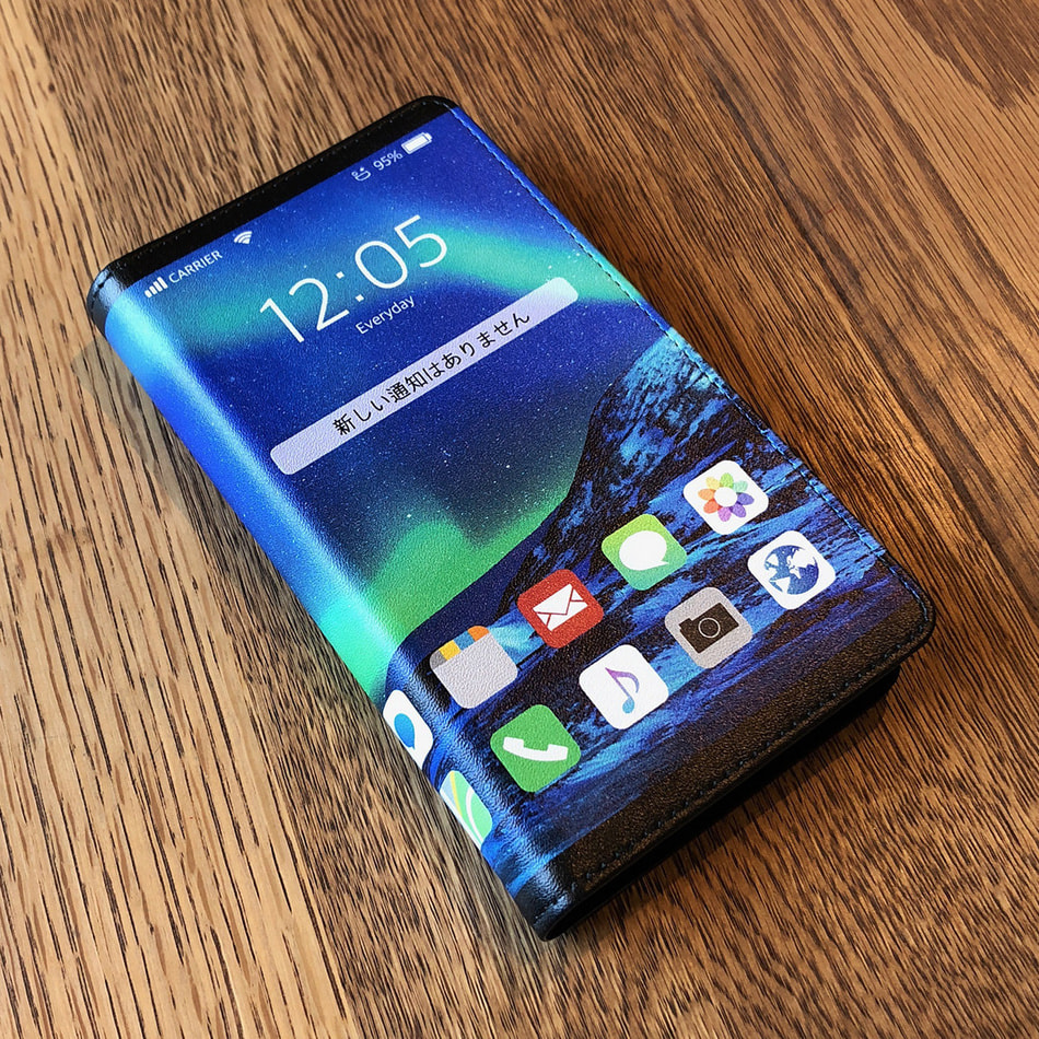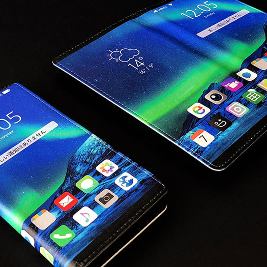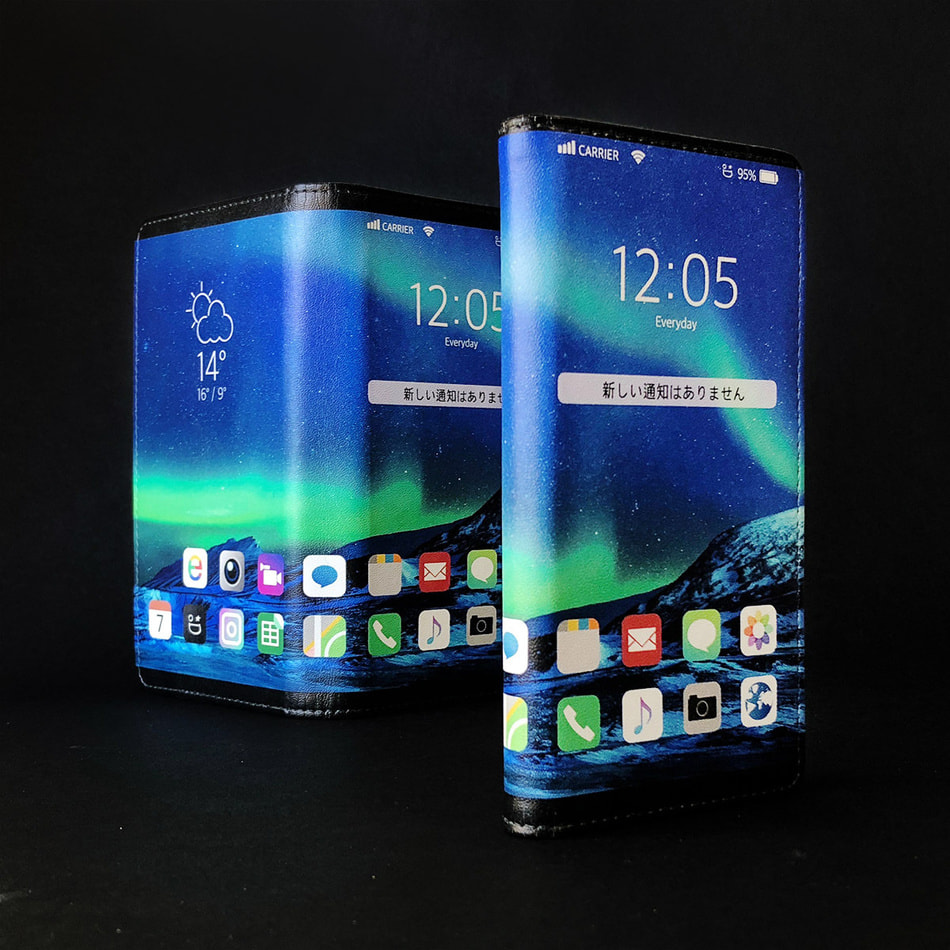 今回は「折りたたみスマホ」ルックな手帳型スマホケースを制作しました。ここ最近、海外のスマホメーカー各社から相次いで「折りたたみスマホ」の開発状況が公開され、2019年の発売をアナウンスする情報も伝わってきています。今年は「折りたたみスマホ元年」になるかもしれません。かつては最新ガジェットといえば日本発であることが普通でしたが、昨今はこのようなワクワクするニュースを日本のメーカー発で伝え聞く機会がすっかり減ってしまいました。そこでエコードワークスは世界の先陣を切るという意気込みを持って、まだどこからも「折りたたみスマホ」が発売すらされていないこの時期から、先走って「折りたたみスマホ」をオマージュしたスマホケースの発売に踏み切りました。