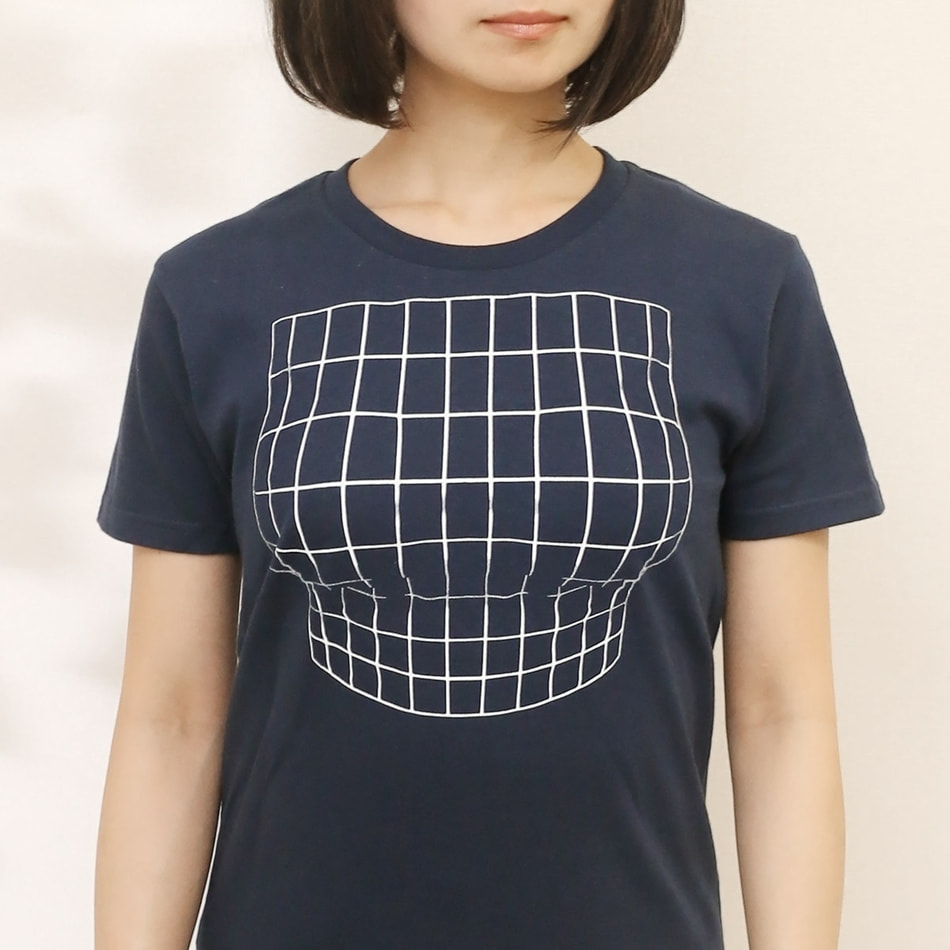 「妄想マッピングTシャツ/ Illusion grid」は、正面を向いた時にだけ 錯視効果により胸元がふくらんで見える、独自のグリッド模様をあしらったプリントTシャツです。