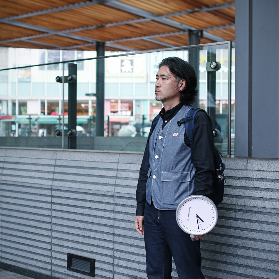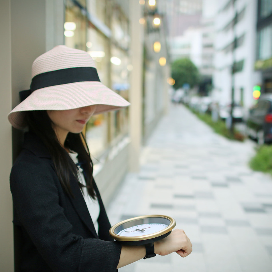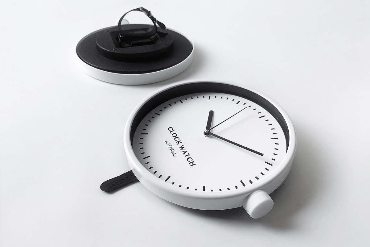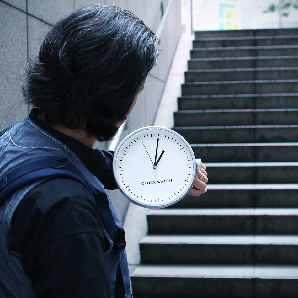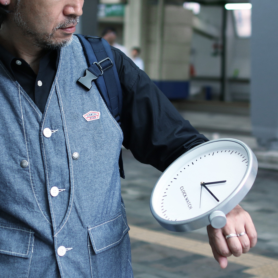CLOCK WATCHはベルトを手首に巻いて携行できる、壁掛け時計サイズの腕時計です。腕時計としての携行性を最小限度に低めることで、抜群の誘目性と視認性を得ることに成功しました。周辺の人々へも景観の一部として時刻を報せることができ、世間に貢献している気分も味わえます。風防には厚さ1.5mmのクリアアクリルボードを採用し、有事の際は護身用の簡易シールドとしても活用できます。