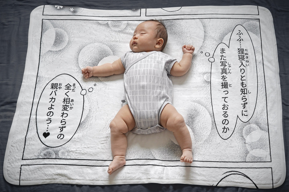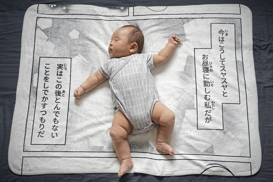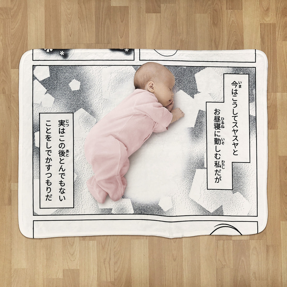 Transform your baby's sleeping pose into a manga comic strip with our Comic-Print Nap Blanket! Featuring speech bubbles and narration that perfectly complement your little one's naptime, this blanket creates a unique comic strip story. Simply take a photo of your baby from above while they nap, and anyone can easily debut their child as a character in a manga.