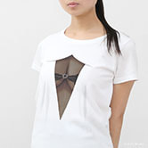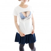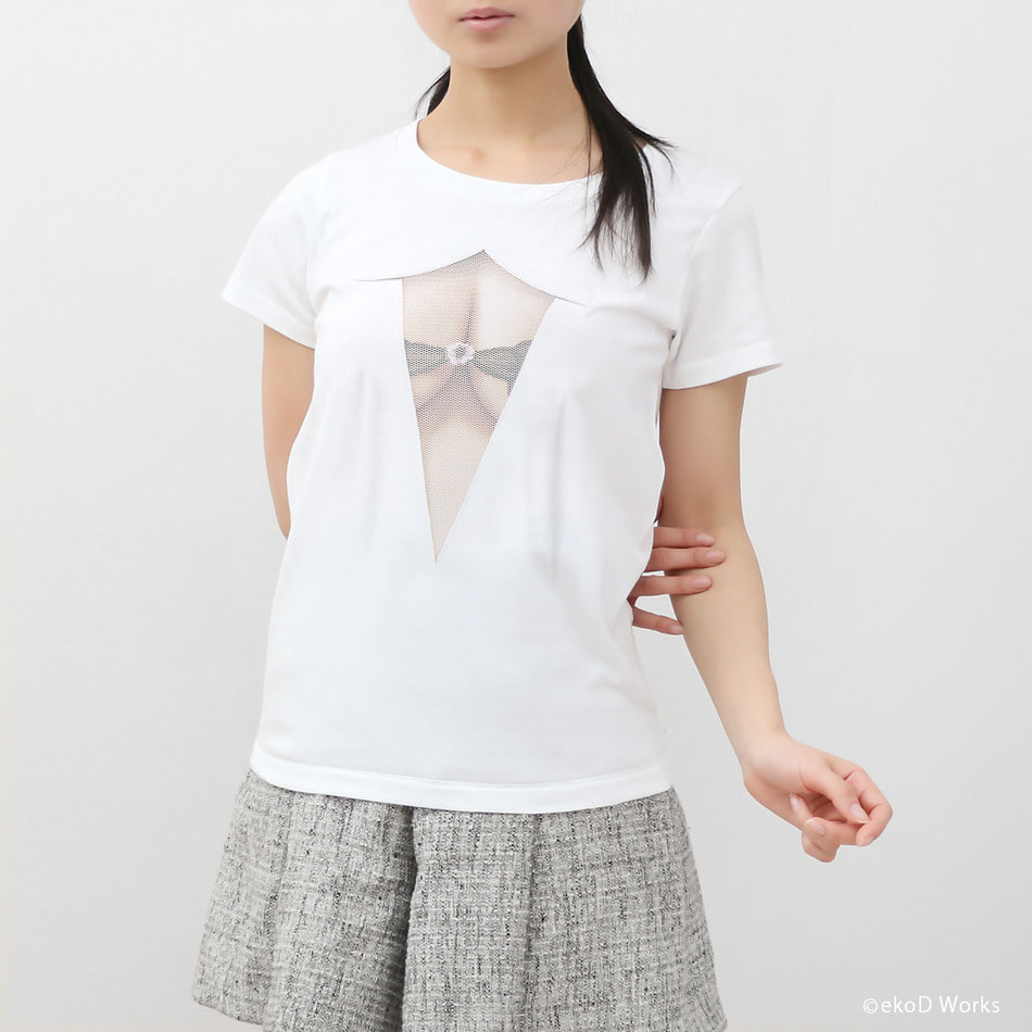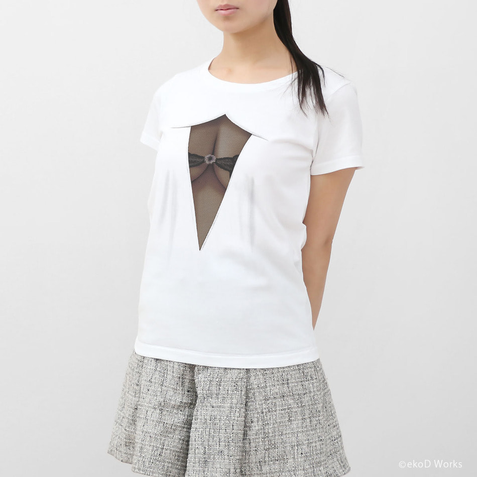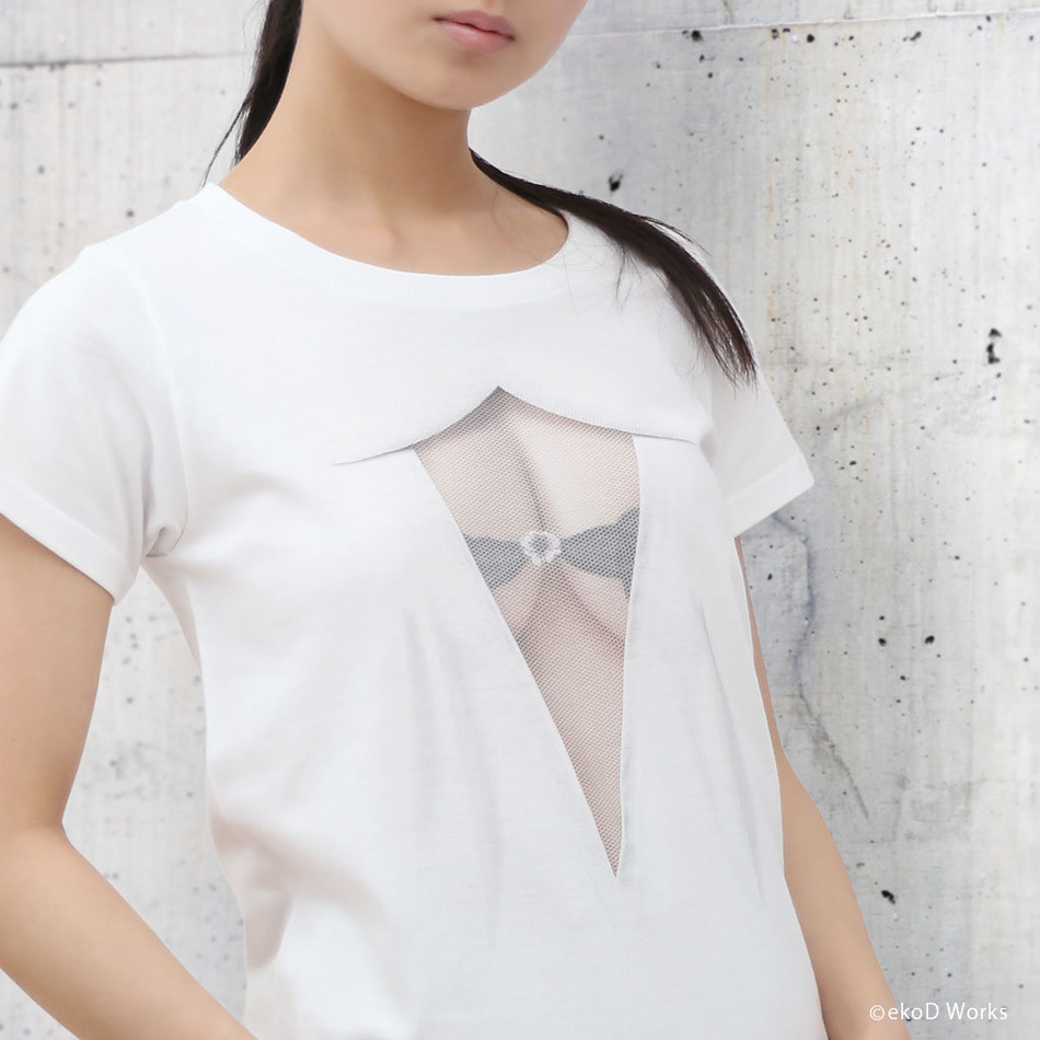 Pretending ignorance, they can't help stealing glances at the mesh covered attractive body. ekoD Works actualized this daydream with its original delusion mapping technology. Put it on, and you'll surely be the center of attraction. ...that's the concept of our "seen through the breast" printed T-shirts.