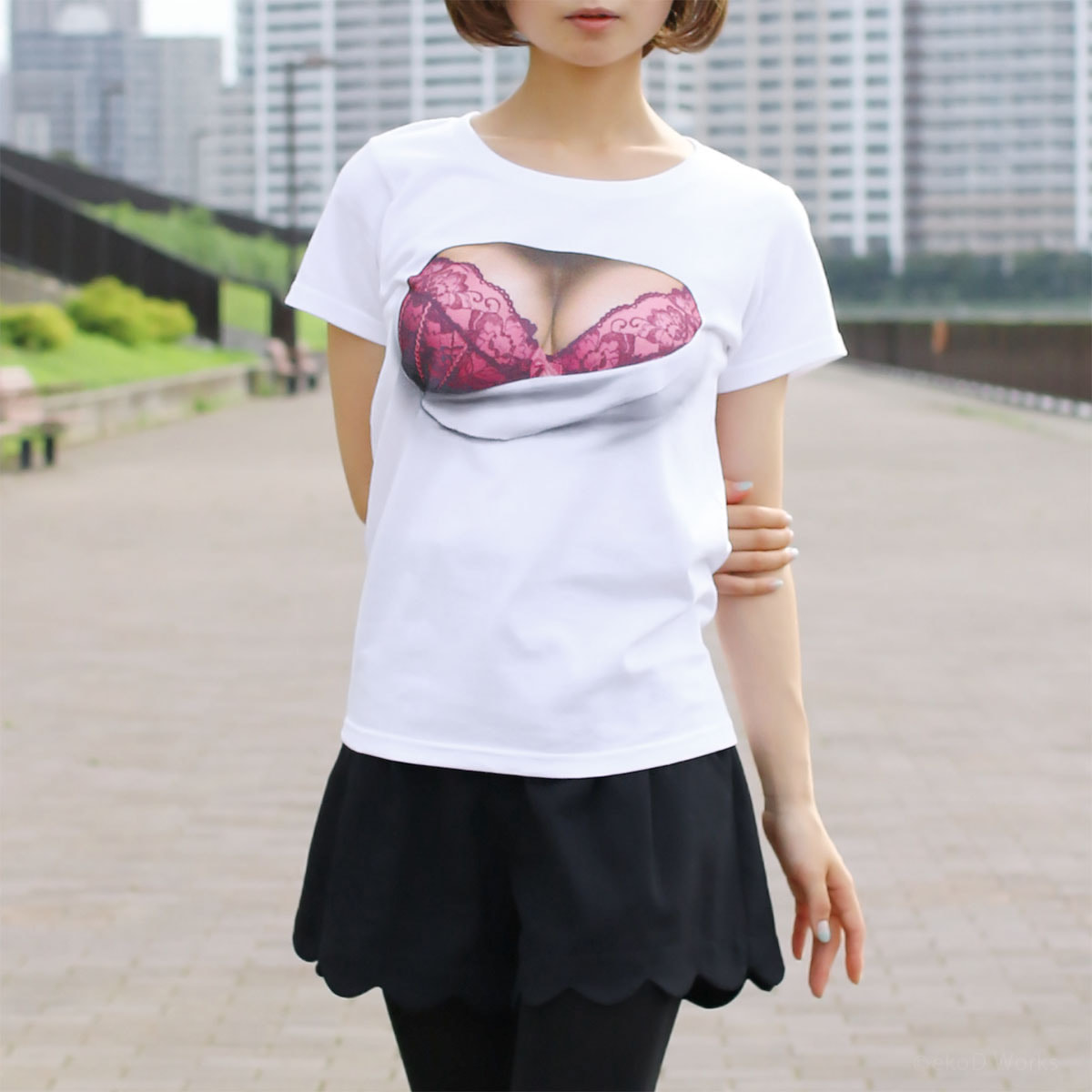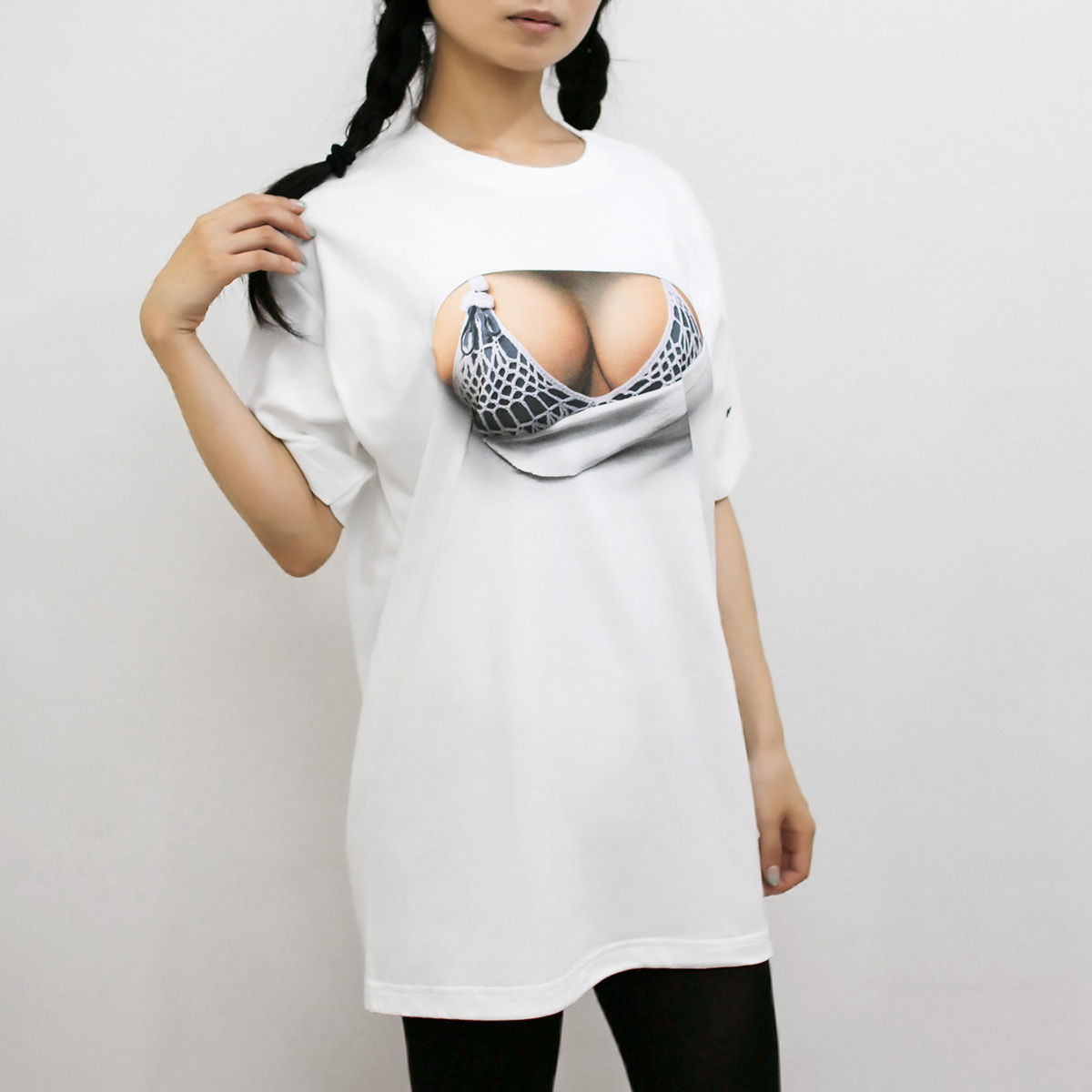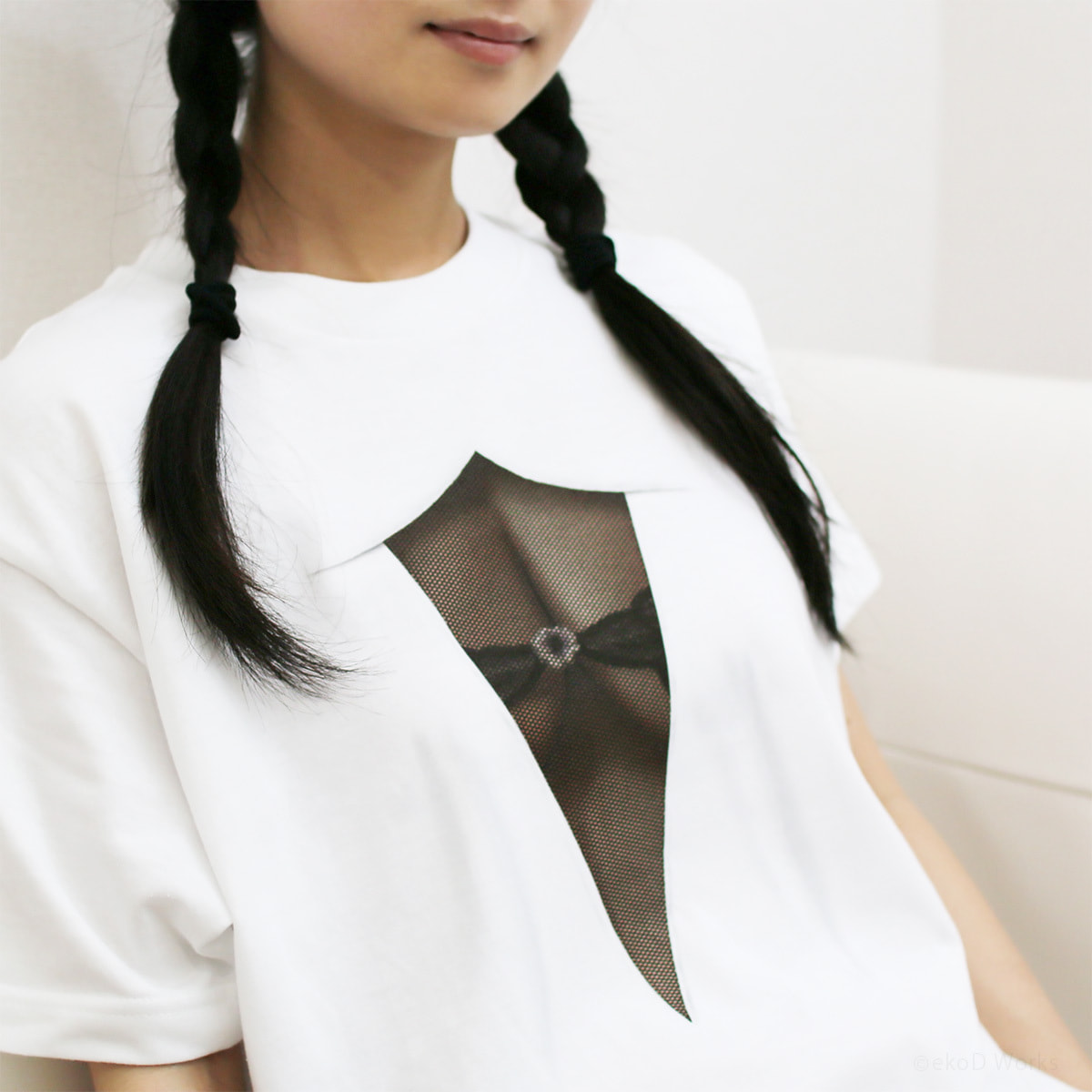 Pretending ignorance, they can't help stealing glances at the mesh covered attractive body. ekoD Works actualized this daydream with its original delusion mapping technology. Put it on, and you'll surely be the center of attraction. ...that's the concept of our "seen through the breast" printed T-shirts.