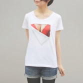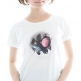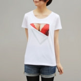 ピチピチのシャツに押し込まれ、窮屈そうなナイスバディ。弾む胸の圧力が白い布地を押しのけて、遂にその胸元が露わになる…。人々がこっそり思い描いている妄想世界を、エコードワークス独自の妄想マッピング技術により実現。これを身に纏えばあなたも人々の注目を集めること間違いなし!?…というコンセプトの「胸元がはだけてしまった風」プリントTシャツです。