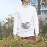 四足歩行から二足歩行へ、目線の変化に伴い胸にその座を奪われた尻。そんな現状を覆し原点回帰を図る尻派の秘策とは…。人々がこっそり思い描いている妄想世界を、エコードワークス独自の妄想マッピング技術により実現。これを身に纏えばあなたも人々の注目を集めること間違いなし!?…というコンセプトの「胸が尻に置き換わる風」プリントTシャツです。