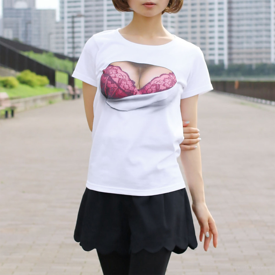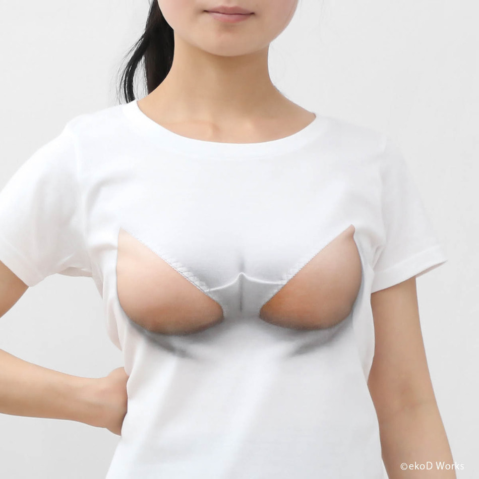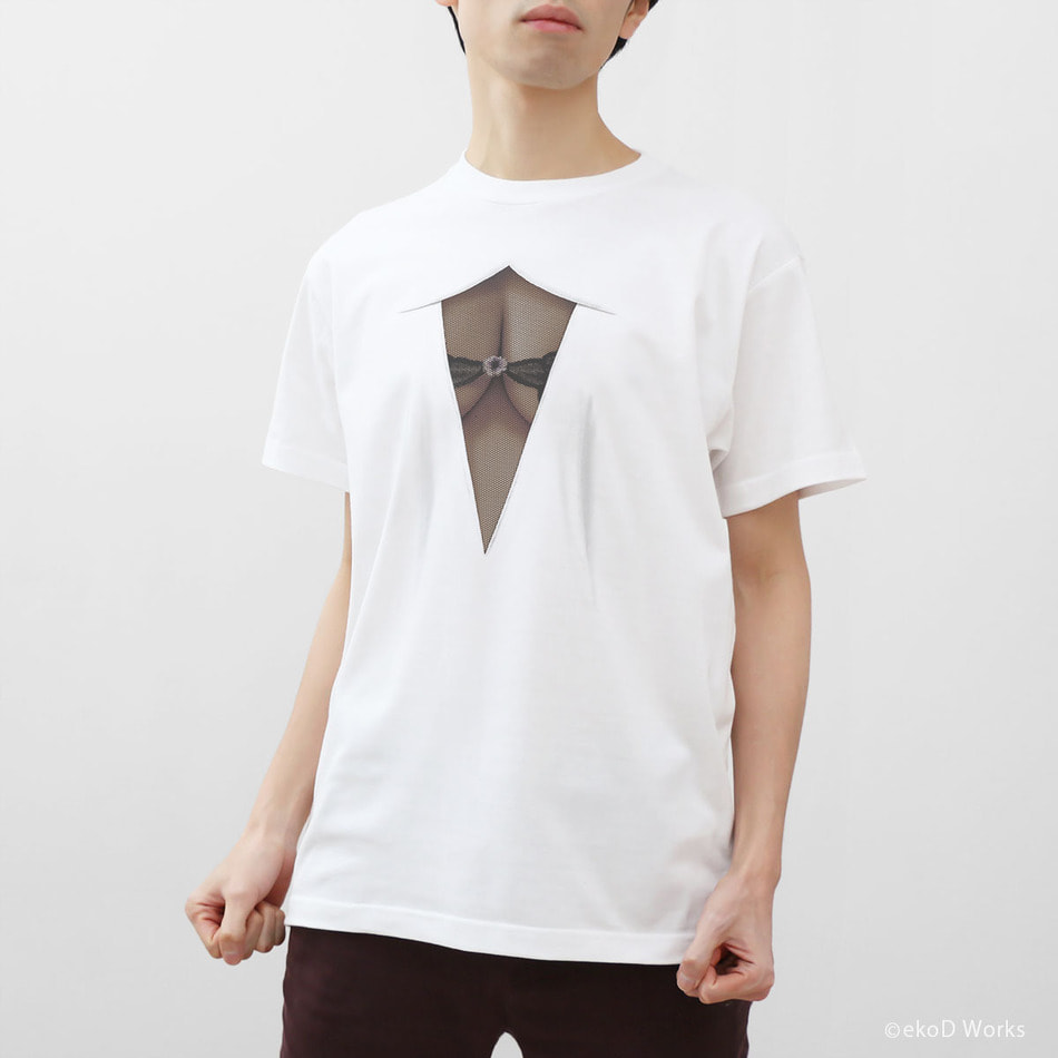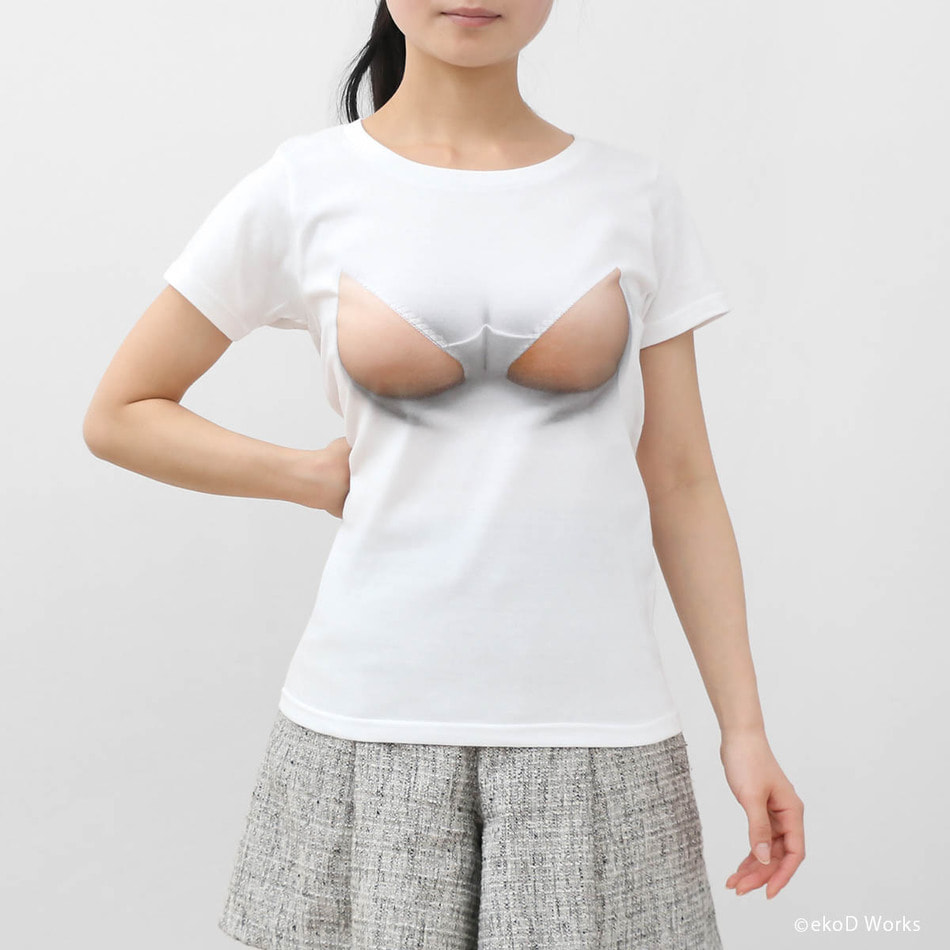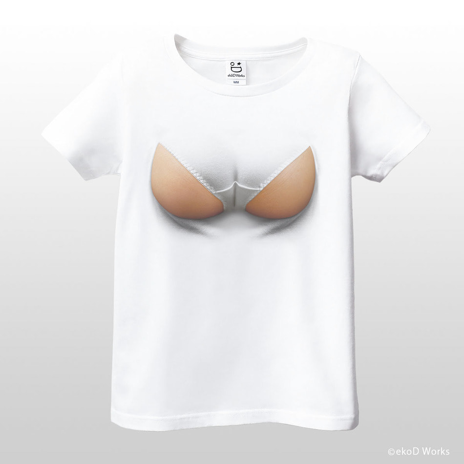 The attractive body looking so tight squeezed in a small shirt. Pushing away the white cloth with the bursting breast, the chest is finally exposed… ekoD Works actualized this daydream with its original delusion mapping technology. Put it on, and you'll surely be the center of attraction. …that's the concept of our "breast laid bare" printed T-shirts.