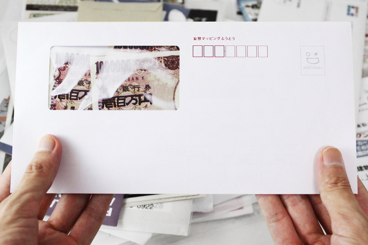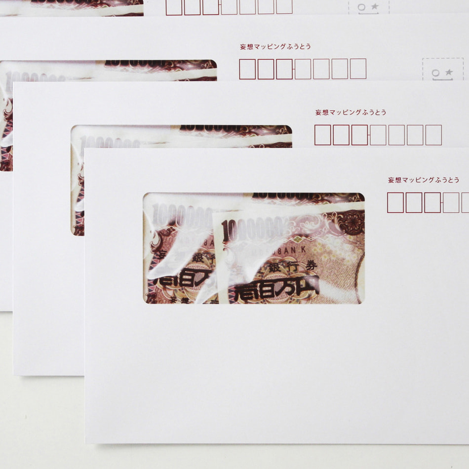 Stacking letters without reading them. When sending someone like this an important document, this is the envelope. The trick is to stuff all his fantasies in, so that he can't resist from opening up the seal. Someone who always says "Money isn't important," or who has a sweet tooth, or that dirty minded friend, or even the guys who are incredibly precious, wouldn't you like to send them a Mousou Mapping Envelope? This is the concept for the printed envelope that "seems to have something inside."