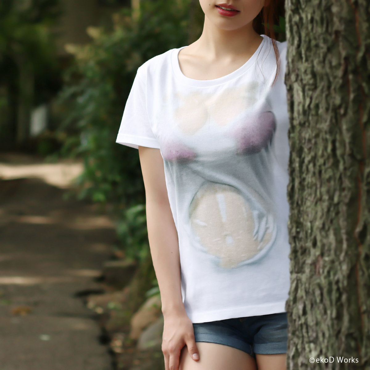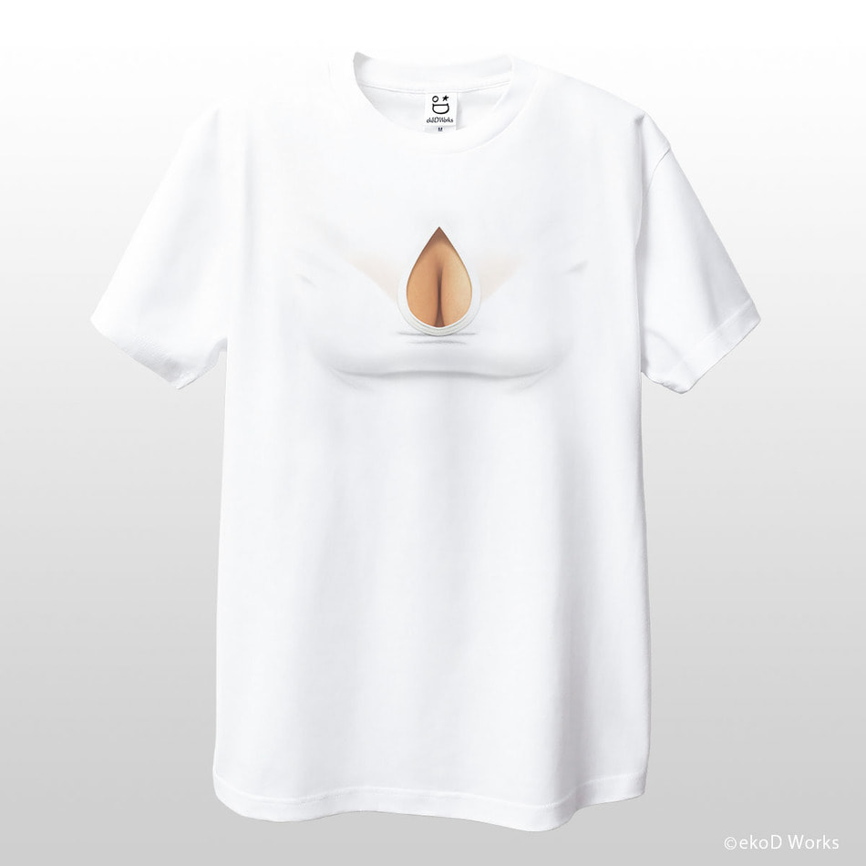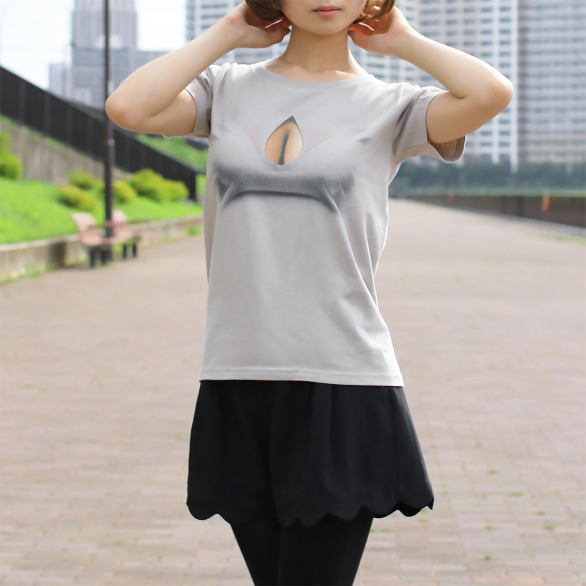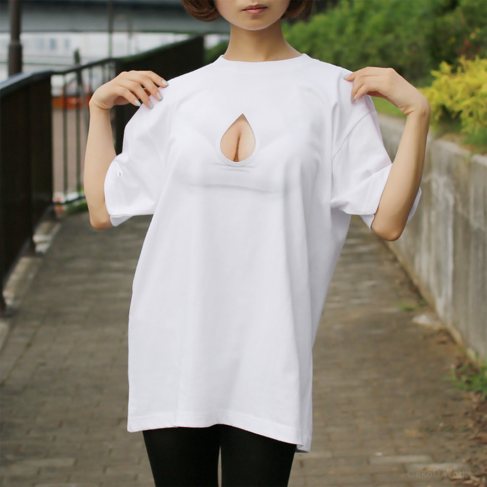 胸元にあしらわれたドロップホールから何気なく覗く胸の谷。 人々がこっそり思い描いている妄想世界を、エコードワークス独自の妄想マッピング技術により実現。これを身に纏えばあなたも人々の注目を集めること間違いなし!?…というコンセプトの「谷間が覗いている風」プリントTシャツです。