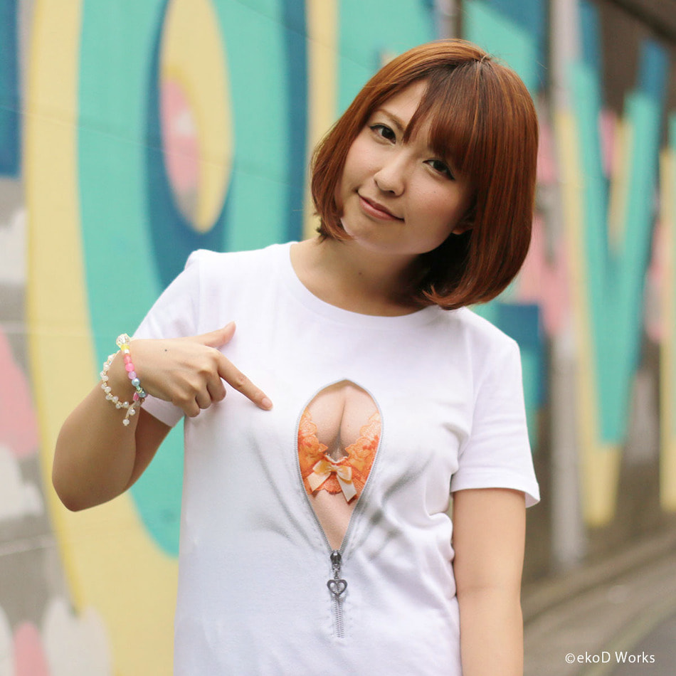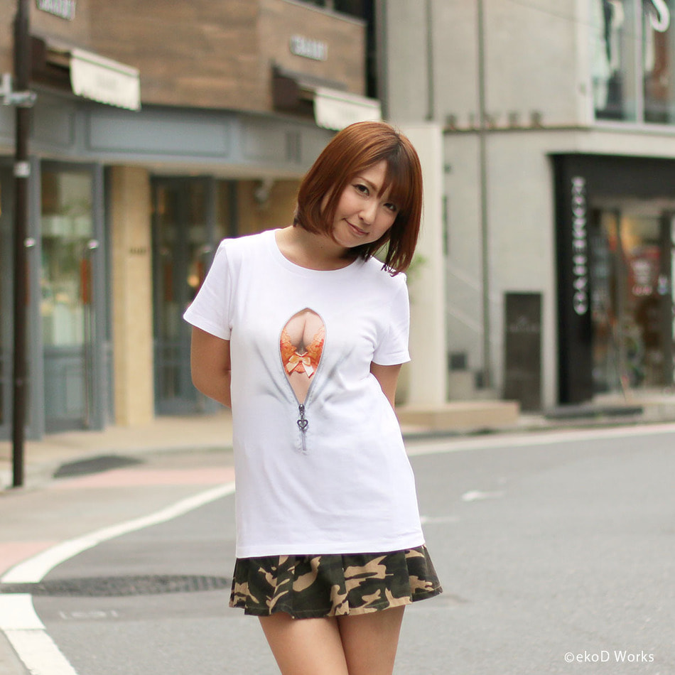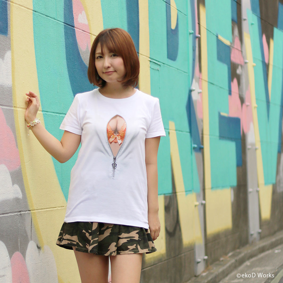 The breast cleavage casually peeping from the key-hole on the chest. The silhouette from the lower part appeals the voluptuous figure. ekoD Works actualized this daydream with its original delusion mapping technology. Put it on, and you'll surely be the center of attraction. …that's the concept of our "cleavage peeping" printed T-shirts.